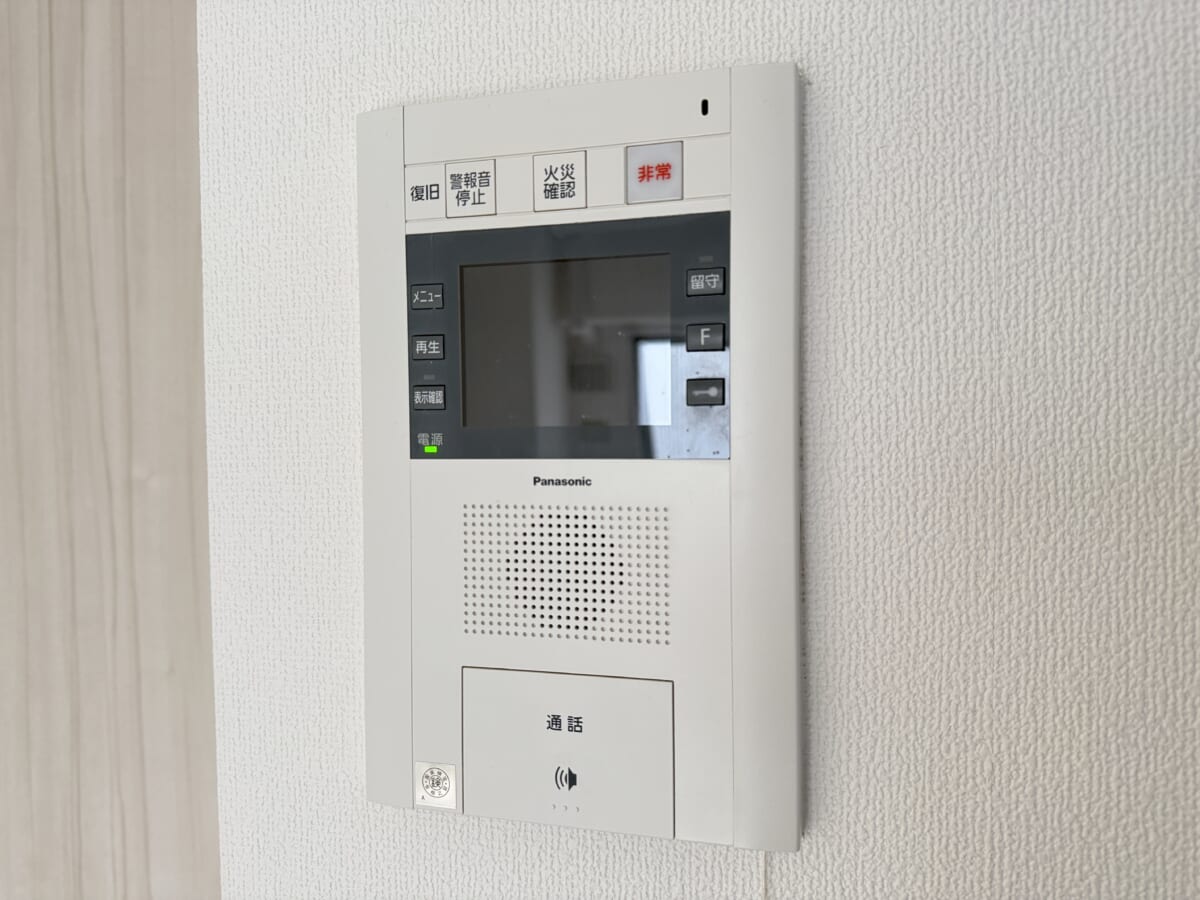 こちらは、Panasonic製のモニター付きインターホンシステムです。壁に設置された本体は、シンプルなホワイトカラーで空間に馴染みやすく、生活感を抑えたデザインとなっています。中央には見やすい液晶モニターが配置されており、来訪者の姿を鮮明に確認できるため、防犯面で大きな安心感をもたらします。通話機能はもちろん、録画・再生機能を搭載しているため、不在時の来訪者も後から確認することが可能です。また、「火災確認」や「非常」ボタンが備わっており、万が一の災害や緊急時にも迅速に対応できる安心設計となっています。さらに、メニュー操作や録画再生のボタンがシンプルにまとめられているため、直感的に扱いやすい点も魅力です。インターホン下部にはスピーカーと通話ボタンがあり、クリアな音声で会話が可能です。日常生活において、セキュリティ性と利便性を高めてくれる重要な設備のひとつです。快適で安全な暮らしをサポートする心強い存在と言えるでしょう。