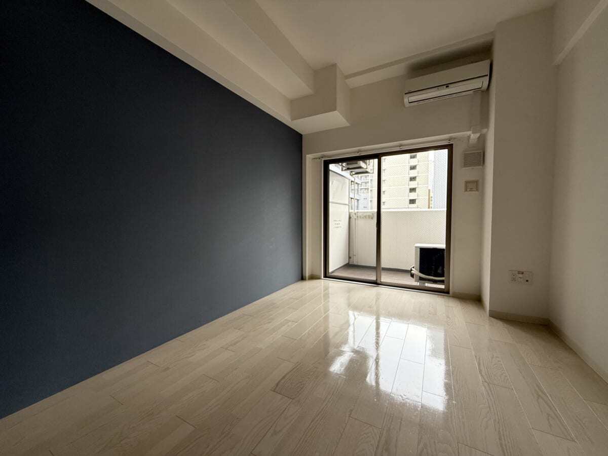 こちらのお部屋は、シンプルでありながら洗練された印象を与える空間に仕上がっています。床は明るい木目調のフローリングで、自然光を反射して部屋全体をより広く明るく見せてくれます。バルコニーに面した大きな窓からはしっかりと採光が取れ、日中は照明をつけなくても快適に過ごせそうです。さらに、バルコニーは奥行きがあり、ちょっとした洗濯物干しや観葉植物を置いて楽しむのにも便利です。室内のアクセントとして、片側の壁には落ち着いたトーンのダークカラーが施され、シンプルながらもスタイリッシュな空間を演出しています。白い壁や天井とのコントラストが効いており、家具を置いた際にも映えるデザインになっています。また、エアコンが設置済みで、一年を通して快適な生活が可能です。コンパクトながらも無駄のない間取りと清潔感ある内装は、一人暮らしにぴったりのサイズ感です。シンプルだからこそ、自分らしいインテリアを楽しみながら落ち着いて暮らせる魅力的なお部屋となっています。