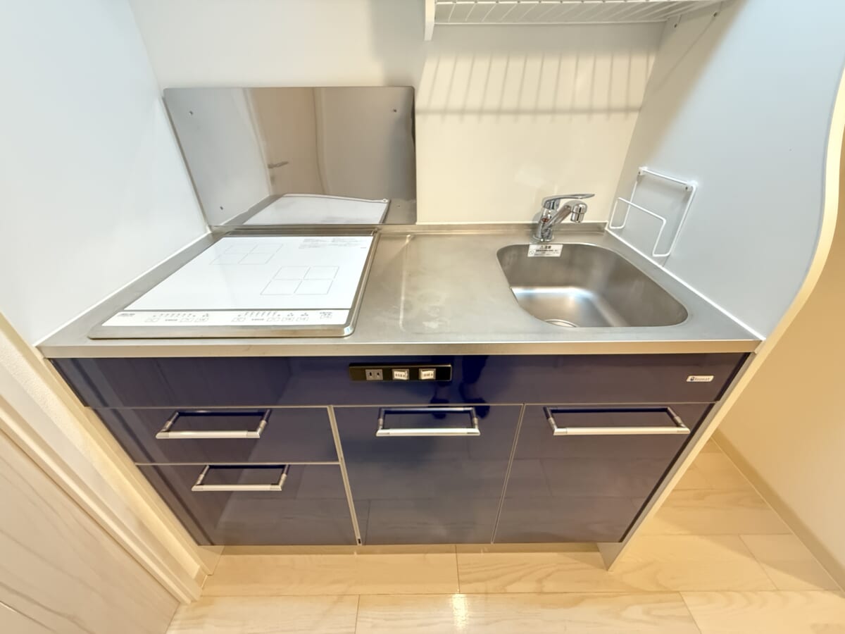 こちらのキッチンは、コンパクトながらも効率的に使えるデザインが魅力です。シンクと調理スペースがバランスよく配置され、シンプルながら料理のしやすさを考えた仕様になっています。IHコンロが備え付けられているため、火を使わない安心感があり、日々の料理も安全に行えます。また、掃除がしやすいフラットな天板は、清潔を保ちたい方に嬉しいポイントです。シンクは程よい深さがあり、洗い物がしやすい設計となっています。収納も充実しており、下部には複数の引き出しと扉付きのスペースが確保されているため、調理器具や調味料、日用品をすっきり整理できます。さらに、上部にはワイヤーラックが設置されているので、食器や調理小物を置くことができ、空間を有効活用可能です。全体的にシックなネイビーカラーのキャビネットがスタイリッシュで、室内の雰囲気を引き締めています。シンプルかつ機能的なデザインで、一人暮らしの方や自炊を楽しみたい方にとって快適に利用できるキッチンスペースです。