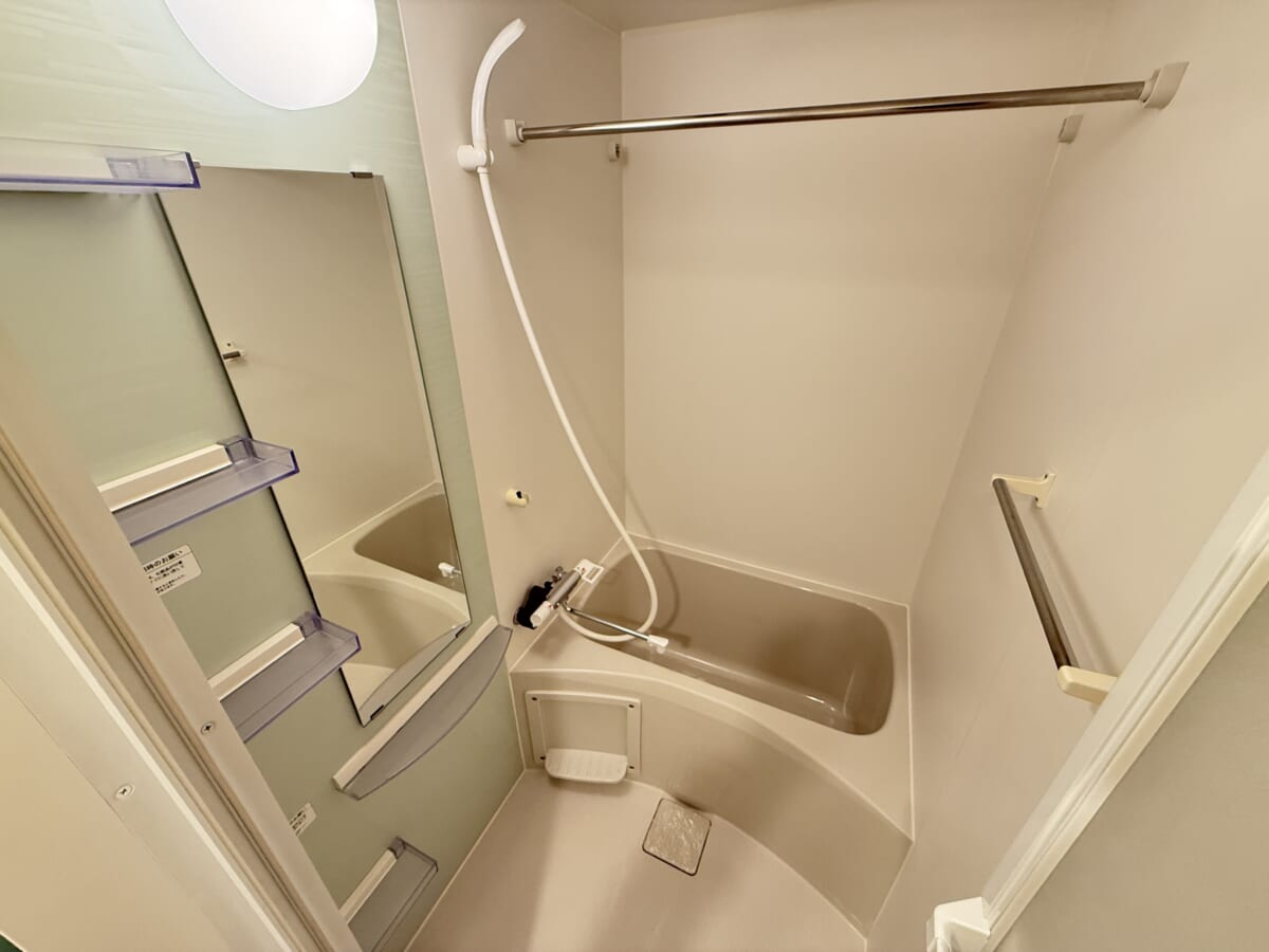 こちらのバスルームは、コンパクトながらも機能性と快適性をしっかりと兼ね備えたデザインになっています。浴槽はゆったりとしたサイズ感で、一日の疲れを癒すのに十分です。ベージュ系の落ち着いたカラーが採用されており、清潔感とリラックス感を演出しています。壁面には大きなミラーが設置され、その周りには使いやすい位置に収納棚が配置されているため、シャンプーやボディソープなどのバス用品をすっきり整理することができます。シャワーは高さを調整できるスライドバー付きで、立っても座っても快適に利用できる仕様です。また、浴室には物干し用のバーも備え付けられているので、雨の日や夜間の室内干しにも便利です。床は水はけが良く、日々のお掃除が簡単にできる点も魅力的です。照明は柔らかな光で空間を明るく保ちつつ、リラックスできる雰囲気を作り出しています。シンプルながらも細部に使いやすさが詰まったこのバスルームは、快適な日常生活を支える心強い設備といえるでしょう。
