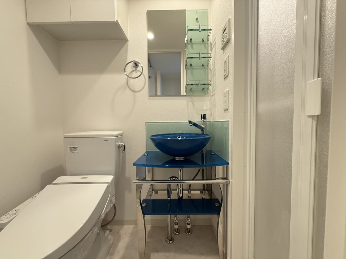 こちらの空間は、シンプルながらも洗練されたデザインが光るトイレ・洗面スペースです。白を基調とした清潔感あふれる内装に、鮮やかなブルーのガラス製洗面ボウルとカウンターがアクセントとなり、モダンでスタイリッシュな雰囲気を演出しています。洗面台下部はオープン仕様で、ステンレスの脚と配管がデザインの一部として見える構造になっており、軽やかで圧迫感を感じさせません。上部には収納キャビネットが設置されており、日用品をすっきりとしまえる実用性も備えています。また、鏡の横にはガラス製の棚が設けられており、小物や化粧品を美しくディスプレイできるのも魅力です。トイレは温水洗浄機能付きの仕様で、快適性にも配慮しています。全体として、機能性とデザイン性を兼ね備えた、日常を少し特別にしてくれる空間となっています。シンプルさと鮮やかな色使いのバランスが絶妙で、毎日の暮らしに心地よい彩りを添えてくれるでしょう。