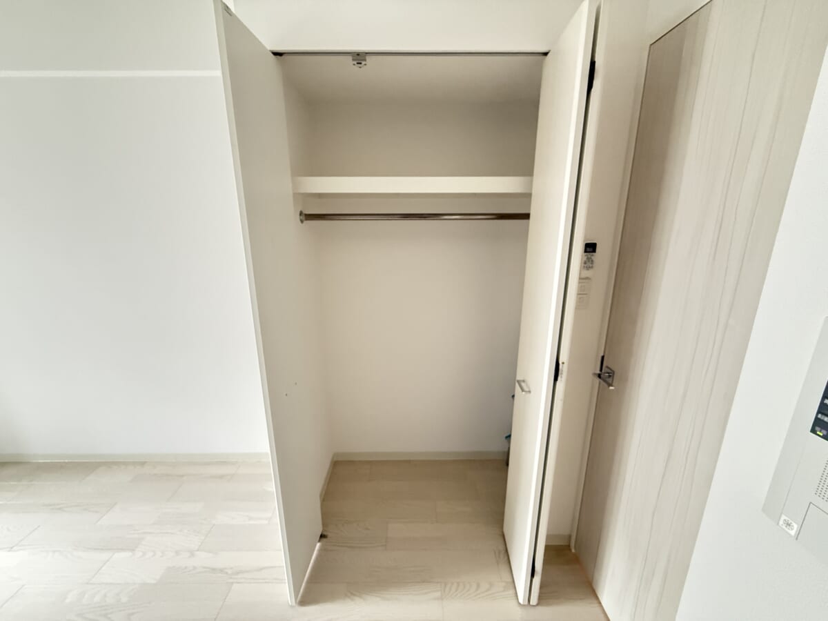 こちらは、シンプルで使い勝手の良いクローゼット収納です。扉を開けると、内部はすっきりとしたホワイトで統一されており、明るく清潔感のある印象を与えます。上部には棚板、中央にはハンガーパイプが設置されており、衣類を掛けて収納するのはもちろん、バッグや帽子などの小物も効率的に整理できます。下部はゆったりとしたスペースが確保されているため、収納ケースやシューズボックスを置いたり、季節ごとの大型アイテムを収納するのにも適しています。両開きのドア仕様で開口部が広いため、中身の確認や取り出しがしやすく、日常的に快適に使える設計です。床から天井までの高さを活かした収納力により、お部屋全体をすっきりと保つことができます。シンプルながら機能性に優れ、どんなライフスタイルにも柔軟に対応できる実用的なクローゼットです。お部屋の整理整頓に役立ち、暮らしを快適にサポートしてくれる空間となっています。