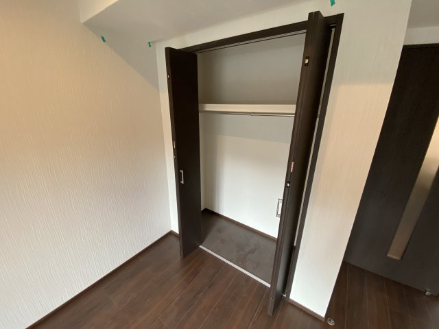 上部には棚が設けられており、バッグや帽子、オフシーズンの衣類などを収納するのに便利です。収納ボックスやケースを組み合わせれば、さらに機能的な空間として活用できます。また、ダークブラウンのドアはお部屋のモダンなフローリングと統一感があり、閉めているときはインテリアの一部として空間を引き締めてくれます。この頼れるクローゼットがあれば、9帖のお部屋を生活感なく広々と快適に使うことができます。衣類が多い方も安心です。