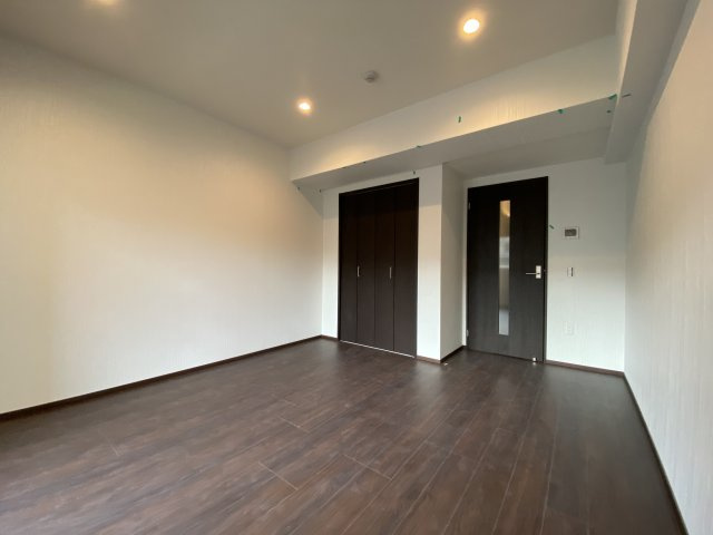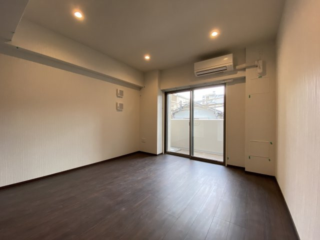 このお部屋の一番の魅力ははなんといってもスタイリッシュさにあります。 ダークブラウンのフローリングが白い壁とダウンライトの光に映え、落ち着きがありながらも洗練された空間を演出しています。広さはゆとりある9帖。ベッドやソファを置いても十分なスペースがあり、自分の趣味やライフスタイルに合わせた自由なレイアウトが可能です。大きな窓からは明るい日差しがたっぷり差し込み、室内はいつもポカポカ。バルコニーへの出入りもスムーズで開放感があります。エアコンも設置済みですぐに新生活スタートが始められます。三宮周辺での快適な一人暮らしをこのおしゃれな空間で始めてみませんか?