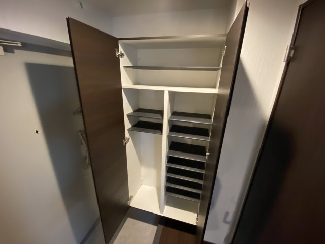 玄関に設置されたこのシューズボックスはただ靴をしまうだけではない機能美あふれる収納です注目すべきは棚が豊富に用意されている点です。段数が多いため、ヒール、スニーカー、ブーツなど、季節や用途に応じてたくさんの靴を整理して収納できます。これだけあれば、おしゃれ好きで靴が多い方も安心です。