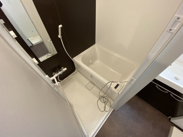 モダンで清潔感あふれるバスルームです。追い焚き機能と浴室乾燥機が完備されており、快適な一人暮らしをサポートしてくれます。追い焚き機能付きのバスタブは冷めにくく、時間を気にせずゆったり入浴を楽しみたい方に最適です。帰宅時間が遅くなっても、すぐに温かいお風呂に入れるのは大きな魅力。日々の疲れをしっかりリセットできます。また、画像奥の壁とバスタブの色のコントラストがモダンな雰囲気を演出しており、鏡も大きめで空間が広く感じられます。