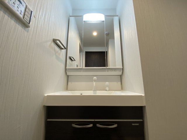 朝の身支度が快適になる機能的な独立洗面台です。一人暮らしでも譲れない設備のひとつ、それが独立洗面台です。この洗面台の最大の魅力は、三面鏡になっていること。鏡の裏はすべて収納スペースになっているため、化粧品やヘアセット用品、洗面用具などをすっきりと片付けられ、洗面周りを常に清潔に保てます。忙しい朝も、サッと物を取り出せて便利です。