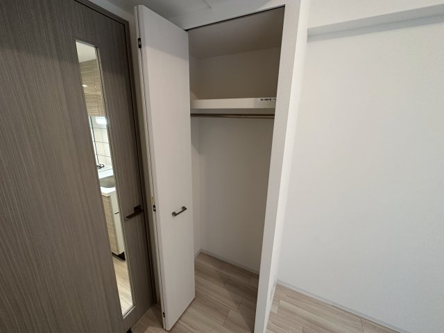 クローゼットは単身生活における衣類収納の要となります。両開きの扉を開けると内部はハンガーパイプが一本通ったシンプルな構造。ここに洋服を掛けて収納することで、シワにならずに保管でき朝の準備もスムーズです。デッドスペースとなりがちな上部にも棚が設けられており、オフシーズンの衣類や小物、カバンなどを置くのに便利です。また、奥行きも十分にあるため、衣装ケースや引き出し式の収納ボックスなどを活用すれば、さらに整理整頓がはかどります。扉を閉めれば室内はすっきりと片付き、生活感を隠せる点も魅力的です。限られたスペースを有効活用するためのシンプルで実用的な収納スペースです。