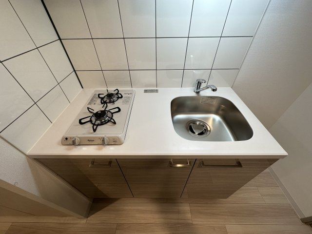 コンパクトながら機能性を凝縮したシステムキッチンは自炊派にも嬉しい設備です。手入れのしやすいシンプルなデザインの天板には、料理の効率を高める2口ガスコンロを搭載。煮る・焼くの同時調理が可能で、忙しい日の時短にも繋がります。シンクは適度な深さがあり、食器洗いや調理の下準備も楽々こなせます。キャビネット部分は木目調のデザインで、空間に温かみをプラス。収納力も確保されており、調理器具や食器をすっきりと整理できます。タイルの壁は油汚れが拭き取りやすく、日々の掃除の手間を軽減。単身者向けの物件としては十分なスペックを備えており、毎日の食事作りを快適で楽しい時間に変えてくれます。