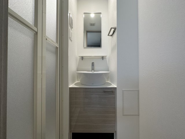 デザイン性の高い独立洗面台は毎日の身だしなみチェックや準備を快適にしてくれるスペースです。洗面ボウルは丸みのあるデザインで柔らかな印象を与えます。鏡裏や下部のキャビネットに収納スペースが確保されており、化粧品や洗面用具などをすっきりと片付けることが可能です。特に洗面台が浴室やトイレと別になっている独立洗面台である点は大きな魅力です。忙しい朝の時間帯でも洗顔、歯磨き、メイクなどを落ち着いて行うことができ、生活の質を高めてくれます。また、水濡れしやすい場所だからこそ、周囲の壁がシンプルなクロスで清潔感があり、お手入れのしやすさも考慮されています。清潔で使いやすい洗面スペースは、気持ちの良い一日を始めるために不可欠です。