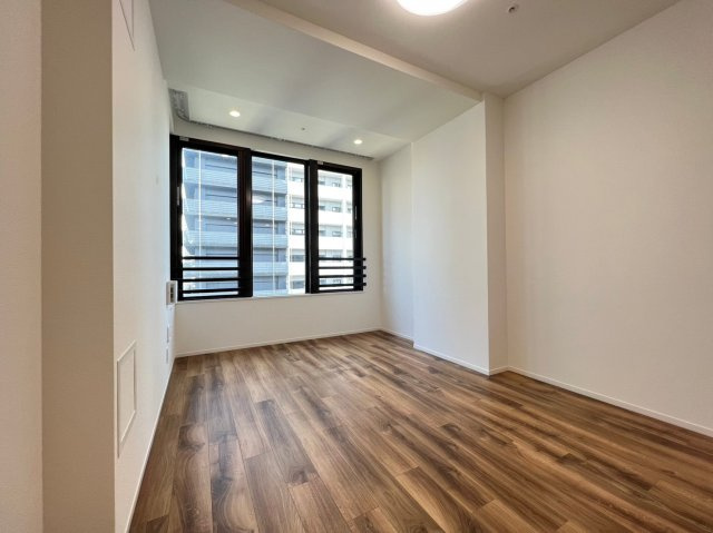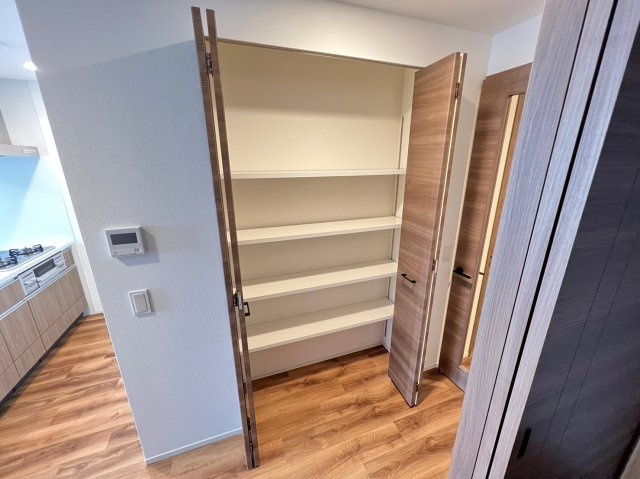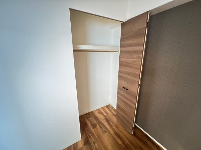お部屋の生活感を抑え、広さを有効活用するために重要なのがこの大容量のクローゼットです。木目調の扉を開けると、そこにはハンガーパイプと上部棚が設置されたシンプルで使いやすい収納空間が広がります。ハンガーパイプには、シワをつけたくないスーツやワンピースなどをたっぷりと掛けて収納可能。上部棚には帽子やバッグ、オフシーズンの衣類などをまとめて収納できます。奥行きもしっかりと確保されているため、市販の衣装ケースや収納ボックスを組み合わせることで、衣類だけでなく、かさばる日用品や季節家電なども効率よく整理できます。扉を閉めれば、室内はすっきりと片付き、広々とした居住空間を保つことができます。