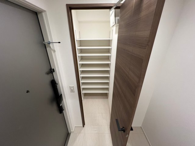 玄関に入ると目に入るこのシューズクローゼットは単身からファミリーまで対応できる圧倒的な収納力が魅力です。一般的なシューズボックスとは異なり、人が入れるほどの広さが確保されており、可動式の棚板が天井近くまで多数設置されています。靴だけでなく、傘、レインコート、ゴルフバッグやベビーカーなどの大型のアウトドア用品まで、玄関周りに散らかりがちなアイテムを全てまとめて収納可能です。玄関の床もタイル張りで、土汚れなども掃除しやすい仕様です。玄関ドアとは別に内側の扉があることで急な来客時にも生活感を隠すことができます。玄関を常に清潔で美しい状態に保つための実用性の高い収納空間です。
