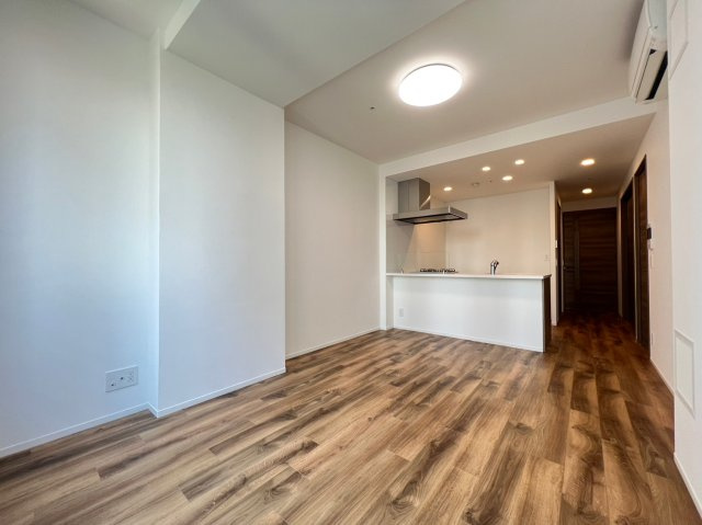 木目調の美しいフローリングが印象的なリビングダイニングは家族が集う中心となる明るく開放的な空間です。壁と天井は白で統一されており木の温もりと相まってシンプルながらも居心地の良いモダンな雰囲気を醸し出しています。大きな窓からは自然光がたっぷりと差し込み、明るい日中は電気をつけずに過ごせそうです。照明もダウンライトやシーリングライトが採用され、空間に合わせた調光が可能です。キッチンとの繋がりが良く、料理中もリビングの様子が見渡せるため、小さな子供がいるご家庭や来客時にも安心です。広さも十分あり、大型のソファやダイニングテーブルを置いてもゆとりがあるため、様々なライフスタイルに対応できる自由度の高い空間です。