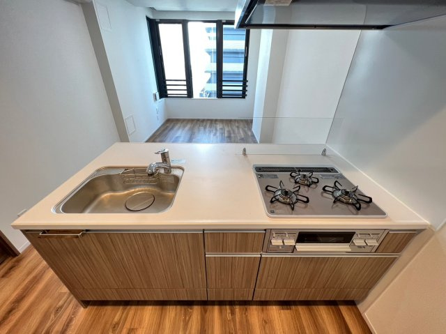 キッチンは料理好きの方に嬉しい3口のガスコンロとグリルを搭載した本格的なシステムキッチンです。複数の調理を同時に進められるため、時短になり手の込んだ料理にも挑戦しやすくなります。グリルを使えば魚料理やオーブン料理なども手軽に楽しめます。デザイン性の高い木目調のキャビネットと清潔感のある白い天板が、明るくおしゃれなキッチン空間を演出。調理スペースも広く確保されており、作業効率が向上します。また、リビングから独立しすぎないセミオープンな配置は、家族や友人との会話を楽しみながら調理ができるという魅力もあります。十分な収納力も備えており、調理器具や食器をすっきりと整理可能です。毎日のお料理が楽しくなる、機能的で美しいキッチンです。