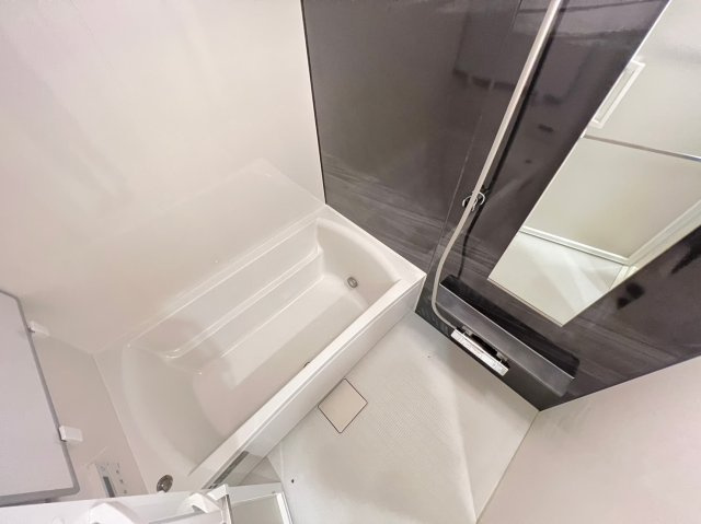 日々の疲れを癒やすバスルームは黒のアクセントパネルが高級感を漂わせるモダンな空間です。特に注目すべきは、「追い焚き機能」と「浴室乾燥機」の2つの充実した設備です。追い焚き機能があれば入浴時間が異なる家族がいても、いつでも温かいお風呂に入り直すことができ、水道代の節約にも繋がります。また浴室乾燥機は、雨の日や花粉の時期、夜間の洗濯物を乾かすのに大変便利。湿気によるカビの発生を抑える効果もあり、浴室を清潔に保つのに役立ちます。広々とした浴槽はゆったりと足を伸ばしてリラックスできるサイズ感。機能性とデザイン性の両方を兼ね備えた快適でリフレッシュできるバスタイムを実現する設備が整っています。