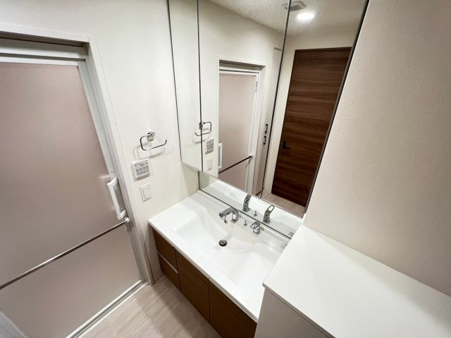 清潔感あふれる独立洗面台は忙しい朝の身支度をスムーズにする機能的なスペースです。洗面ボウルが広く、洗顔や手洗いも快適に行えます。特筆すべきは鏡裏に収納スペースが確保された三面鏡タイプであること。化粧品やドライヤー、洗面用具などをまとめて収納でき、水回りをごちゃつかせずに美しく保てます。また、洗面台の下部には引き出し式のキャビネット収納もあり、収納力が抜群です。デザインも落ち着いた木目調で、高級感があり、空間に調和しています。洗面台の横にはタオル掛けやスイッチ類が配置され、使い勝手にも配慮。浴室と隣接しているため、家事動線もスムーズで快適な日常生活をサポートします。
