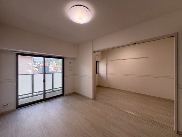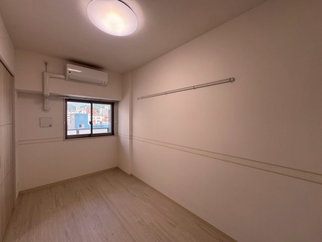 洋室はプライベートな時間を過ごすための落ち着いた寝室に最適です。コンパクトながらもエアコンが設置済みで、窓からは十分な光が入る明るい空間であることが分かります。窓には外の景色を楽しみつつプライバシーを保護する工夫が施されています。また、壁には室内物干し用のバーが取り付けられており、天候を気にせず洗濯物を干せるため、家事の効率が向上します。さらに、クローゼットがこの部屋にあり、衣類を収納すれば、生活空間をすっきりと保つことができます。LDKと引き戸で区切れるため、来客時にはプライバシーを確保でき、また開け放てば一体の空間としても使え、用途に応じて柔軟に対応できます。