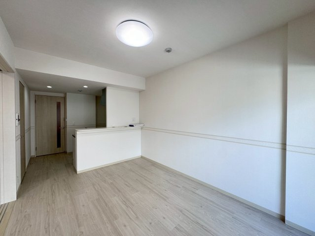 明るい木目調のフローリングと白を基調とした壁紙が清潔感と温もりを感じさせるリビングです。ダイニングと引き戸の奥にある洋室とを繋げて広々と使える設計であることが分かります。引き戸を開放すれば約10帖以上のゆとりのある大空間として利用でき、家族や友人が集う際にも便利です。またキッチンは対面式カウンターとなっており、料理をしながらリビングの様子が見渡せ、コミュニケーションが取りやすい配置です。大きな窓からは採光が確保されており、開放感も抜群。多目的な使い方ができる柔軟な空間は多様なライフスタイルに対応し、日々の生活にゆとりと快適さをもたらします。