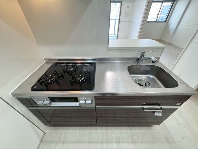 キッチンはお料理好きには嬉しい3口ガスコンロとグリルが搭載されたシステムキッチンです。複数の調理を同時に行えるため、手の込んだ料理や、忙しい日の時短調理にも対応できます。スタイリッシュなステンレスの天板は、油汚れにも強く、日々のお手入れがしやすい設計です。グリルを使えば魚焼きやオーブン料理を手軽に楽しむことができます。さらに、LDKとの間にはカウンターがあり、配膳がしやすいだけでなく、ちょっとした軽食を取るスペースとしても活用できます。下部の木目調のキャビネットはシックな色合いで空間を引き締め、十分な収納力を確保。機能性とデザイン性を両立させた毎日の料理が楽しくなるキッチンです。