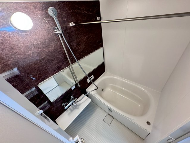 一日の疲れを癒やすバスルームは深みのあるマーブル模様のアクセントパネルが落ち着いた雰囲気を演出しています。ゆったりとした浴槽は肩まで浸かってリラックスするのに十分なサイズです。こちらのお風呂の大きな魅力は「浴室乾燥機」が完備されている点です。雨の日や花粉の時期でも洗濯物を気にせず干すことができ、家事のストレスを軽減します。また、浴室内の湿気を取り除くことでカビの発生を抑制し、常に清潔で快適なバスルームを保つことができます。さらに、便利なシャワーフックや鏡、シャンプーなどを置ける棚も設置されており、使い勝手も考慮されています。機能的で上質な空間で、快適なバスタイムを楽しめます。