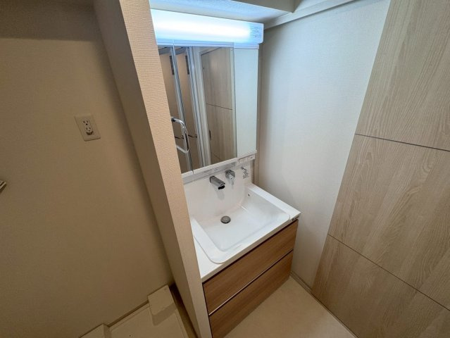 独立洗面台は毎日の身だしなみを快適に整えるための機能が凝縮されています。三面鏡タイプとなっており、鏡の裏側がすべて収納スペースになっているため、化粧品や洗面用品、ストック類などを隠して収納でき、洗面台周りをすっきりと保てます。幅広の洗面ボウルは洗顔や手洗いがしやすく、水ハネも気になりにくいデザインです。下部には引き出し式のキャビネット収納もあり、収納力は十分。また、洗面台が浴室やトイレと独立しているため、家族で利用時間が重なっても気兼ねなく使え、生活の質を高めてくれます。明るい照明付きで、朝の準備や夜のケアをスムーズに行える、清潔感あふれる機能的な空間です。