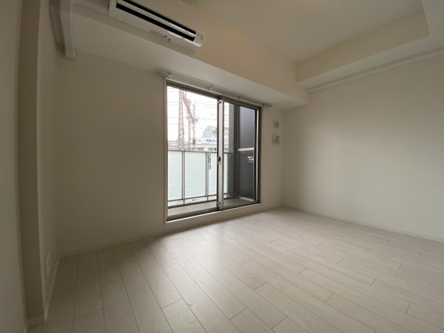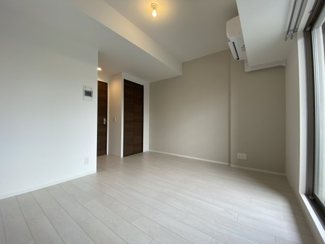 洋室は一人暮らしに最適な広さで、明るい木目調のフローリングと清潔感のある白い壁が、開放的でモダンな空間を演出しています。大きな窓からは十分な自然光が入り、室内全体が明るく気持ちの良い朝を迎えられます。窓の外にはバルコニーもあり、ちょっとした気分転換にも最適です。ドア付近にはTVインターホンが設置されており、来訪者の確認ができてセキュリティ面も安心です。エアコンも設置済みのため、入居後すぐに快適な室温で過ごせる点も魅力です。シンプルな間取りなので、ベッドやデスク、収納家具などの配置がしやすく、自分のライフスタイルに合わせた自由なレイアウトを楽しめます。快適なシングルライフを送るための機能的で居心地の良いプライベート空間です。