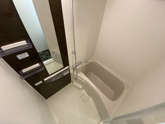 毎日の疲れを癒やすバスルームは黒のアクセントパネルがシックでモダンな印象です。浴槽は緩やかなカーブを描いており、リラックスして入浴できる形状です。このバスルームの最大の特長は、「浴室乾燥機」を完備している点です。雨の日や梅雨時、花粉の時期など、外に洗濯物が干せない時に大活躍します。浴室内に洗濯物を干し、乾燥機を作動させることで、効率よく衣類を乾かすことが可能です。また、乾燥機能を使って浴室内の湿気を取り除くことで、カビの発生を抑制し、常に清潔な状態を保ちやすいのも大きなメリットです。便利なシャワーラックや鏡も設置されており、機能性とデザイン性を兼ね備えた、快適なバスタイムを実現する空間です。