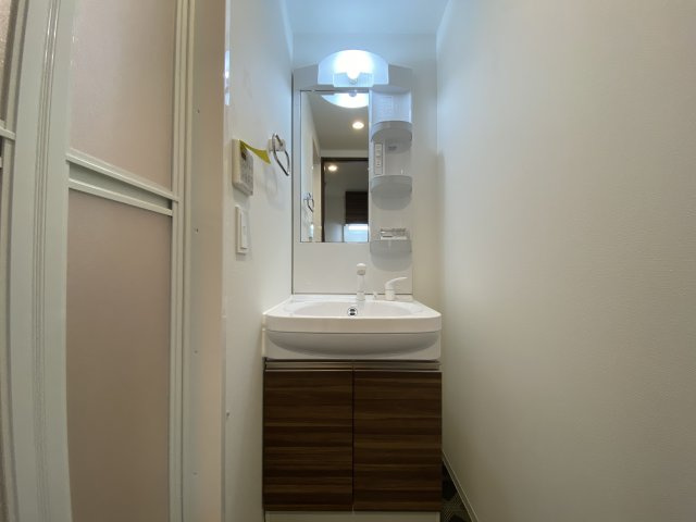 こちらの独立洗面台は機能性とデザイン性を両立させた設備です。丸みのある洗面ボウルと明るい照明付きの鏡が特徴で、清潔感があります。特に鏡の横には小物入れやボトルなどを置ける棚が設けられており、化粧品や歯ブラシなどを整理整頓しやすい工夫が施されています。また、洗面台の下部には引き出し収納があり、タオルや洗面用具のストックなどを隠して収納できます。お風呂やトイレとは別の空間に独立して設置されているため、時間を気にせずゆっくりと身支度ができます。朝の混雑時や来客時にも便利で、特に女性の方にとっては、メイクやヘアセットなど、毎日の身だしなみに集中できる嬉しい設備です。