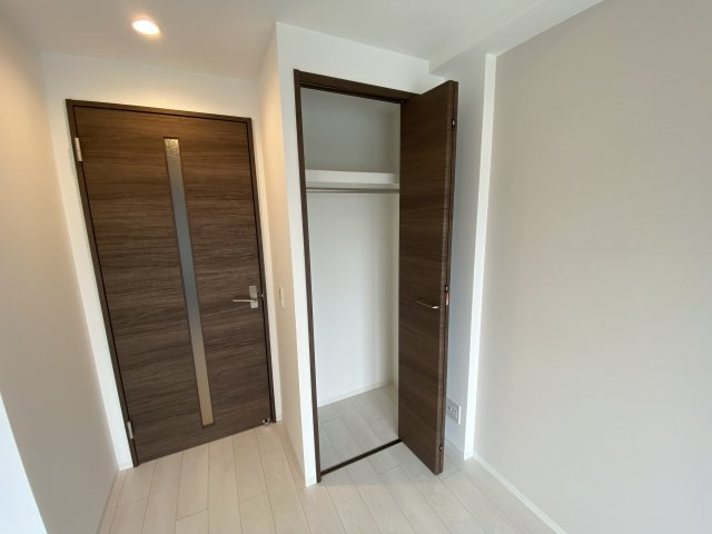 洋室の生活空間をすっきりと保つために不可欠なのがクローゼットです。木目調の扉を開けると内部はシンプルな構造で、上部棚とハンガーパイプが設けられています。ハンガーパイプにはシワを付けたくないシャツやコートなどをたっぷりと掛けて収納でき、服の出し入れが非常にスムーズです。上部棚は普段あまり使わないバッグやオフシーズンの衣類、寝具などを収納するのに便利です。奥行きも十分にあるため、市販の引き出し式の収納ケースなどを活用すれば、衣類を種類別に細かく整理でき、収納力をさらに高めることができます。扉を閉めれば室内は常に片付いた印象になり、居室スペースを広く使うことができます。