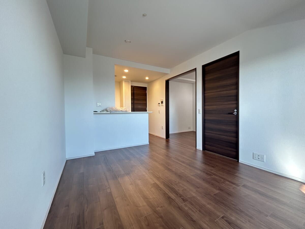 キッチンと洋室へ繋がるドアを含んだ開放感のあるリビングの様子を示しています。床は落ち着いたダークブラウンの木目調フローリングで統一され壁や天井の白との対比がモダンで洗練された印象を与えます。キッチンがカウンターの奥に配置された独立性の高い間取りであることが分かります。これにより、生活感を隠しつつ、食事の受け渡しがしやすい効率的な空間です。