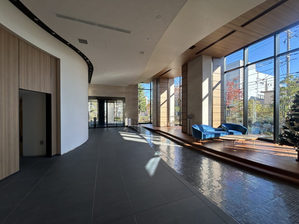 奥にはブルーのソファが配置されたラウンジスペースがあり、ゲストとの待ち合わせや住民同士の交流の場として利用できます。駅直結の利便性だけでなく、このような上質で洗練された空間が、日々の暮らしに豊かさをもたらしてくれます。
