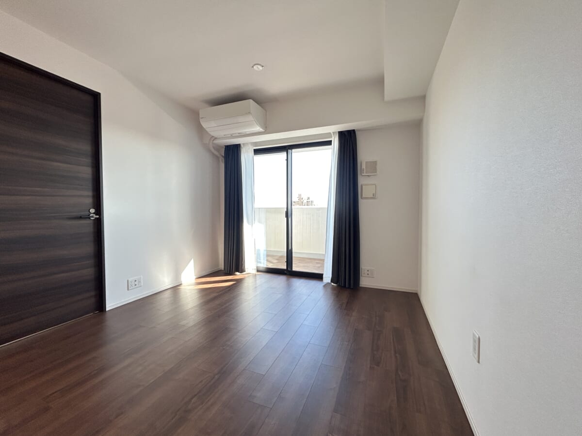 大型のサッシから明るい日差しが差し込み、リビングが明るい空間であることが分かります。バルコニーに直接出られるため、換気や洗濯物の出し入れもスムーズです。また、リビングにはエアコンが設置済みで、引っ越し後すぐに快適に過ごせる点も魅力です。このリビングは家族団らんや友人をもてなす場として、上質な都心生活を演出します。