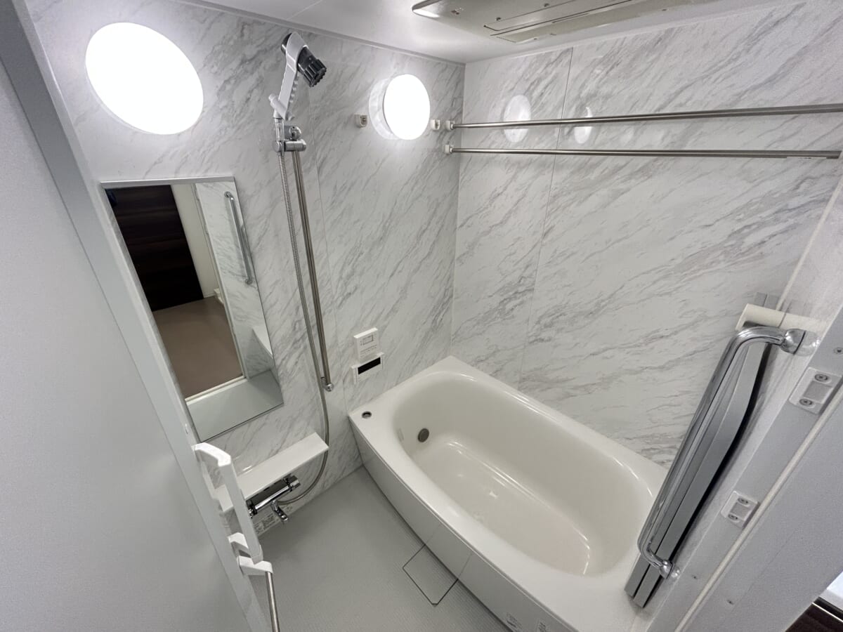 壁面が明るい大理石調のパネルでデザインされたホテルライクなバスルームです。全体的に明るい色調でまとめられ、清潔感と高級感が漂います。特に注目すべきは、ミストサウナ機能が搭載されていることです。自宅で手軽にミスト浴を楽しめ、血行促進やリラックス、美肌効果なども期待できます。