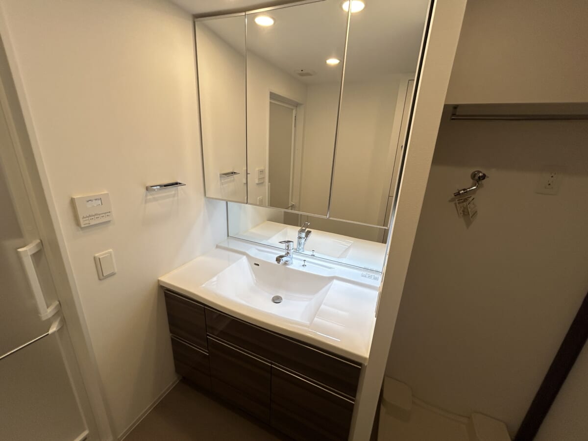 洗面台横の壁にはタオルハンガーやリモコンが設置されており、機能的な空間です。朝の忙しい時間帯でも、二人並んで身支度ができるほどのゆとりを感じさせ、美しさと実用性を兼ね備えた設備です。