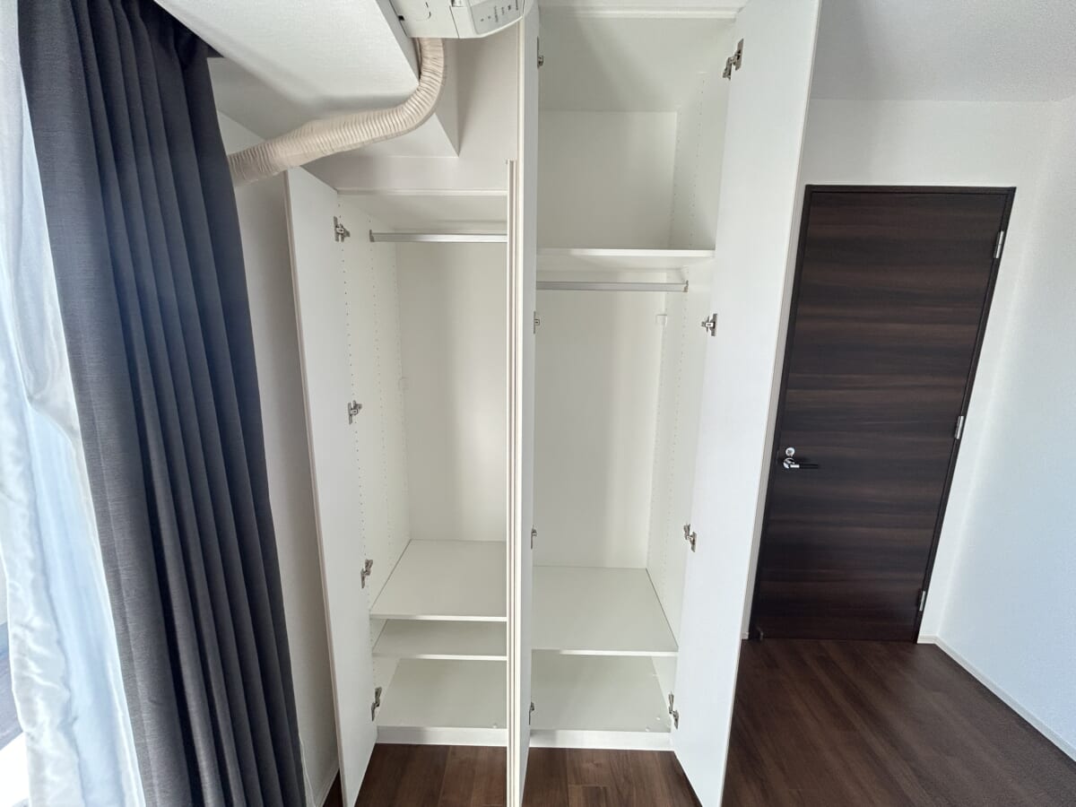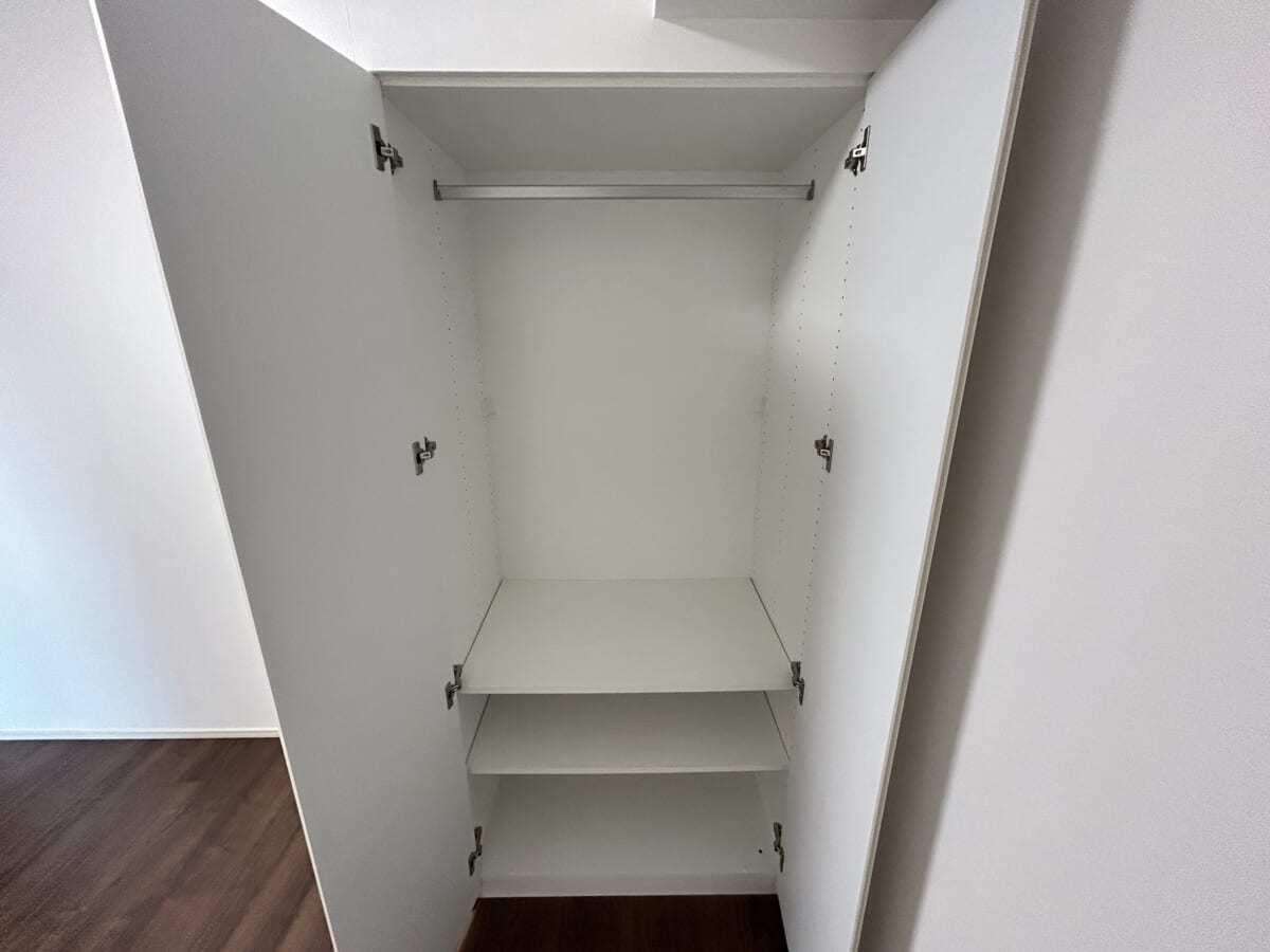 居室に備え付けられたクローゼットはは2枚扉、1枚扉のクローゼットで、内部は清潔感のある白い建具で統一されています。どちらのクローゼットも、上部にはハンガーパイプが設置されており、洋服をシワなく吊るして収納できます。そして、パイプの下には棚板が設けられており、畳んだ衣類や小物、バッグなどを分けて整理することが可能です。