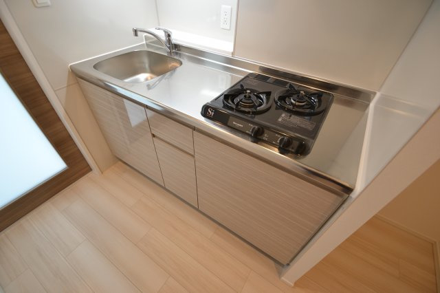 キッチンも大きめになっており、シンク、コンロ、調理スペースどれをとっても十分のスペースですね!ガスコンロ2口がいいですよね