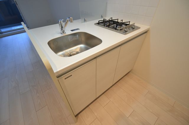 キッチンも白基調で部屋にあってる内装ですね!もちろん2口コンロで前向きなのでテレビを見ながらだったり部屋の様子を見ながら作業ができるのも良いポイントですね!!広さもあるので作った後のお皿を置いたり調味料を置いたり器具を置いたり等十分に使えるスペースがありますね!!キッチン下の収納も広いので色々な物を置く事も出来そうですね!!