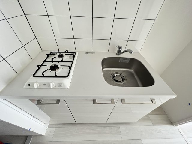 コンロは2口ガスコンロとなってます!!シンク・調理スペースも十分あるので料理も楽しいですね!!キッチン右には冷蔵庫置き場もしっかりあるので便利ですよ!!キッチン下には鍋やフライパンなど収納スペースがあるのも嬉しいですね!!色も白で統一されており綺麗ですね!!