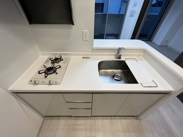 コンロは2口コンロになってます!!コンロの横の隙間も広いので調味料やお皿を置くスペースが十分確保できますね!背後には冷蔵庫を置くスペースがあり導線がつながって料理もしやすいですね!!食器を洗う際には土台を出して机のスペースを広げることもできるので良いですね!キッチン下の収納も広いのでお皿もキッチン用品も置けますね!
