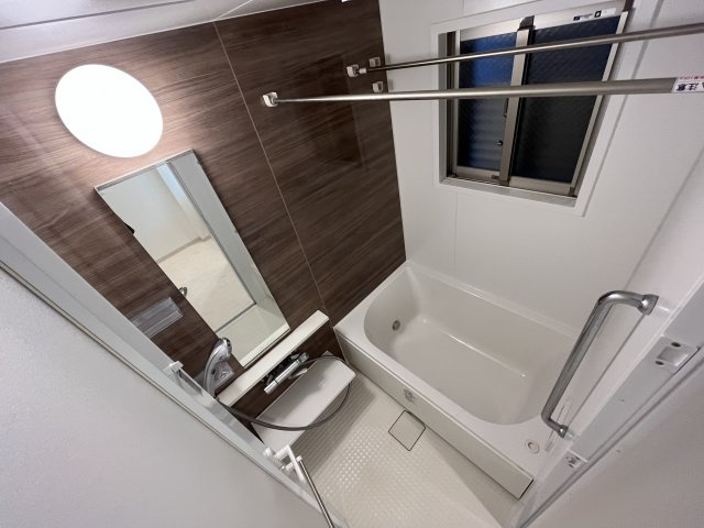 お風呂は浴槽があります!充分浸かることのできるスペースがありますね!もちろん座ることも可能で鏡の前にはシャンプーなどを置くスペースがあります!!こういったちょっとしたスペースがすごく助かりますね!!洗濯物を掛けるところもあり室内乾燥も付いているので雨の日でも安心ですね!!