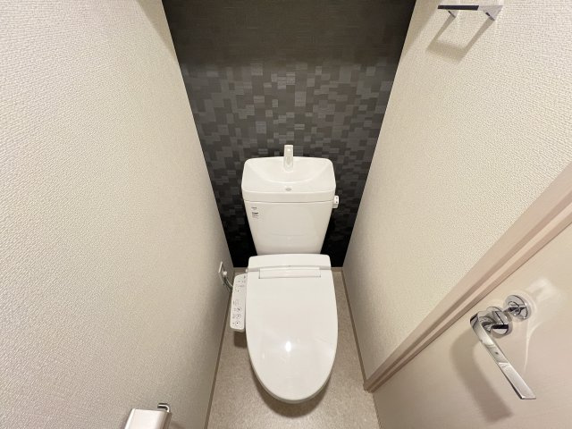 次にトイレをご紹介いたします!ウォッシュレット付きで、温水洗浄便座などの機能も付いてます!冬場など寒いときに、便座が冷たいとひんやりしちゃいますよね、ですが便座温かくできるので安心です!トイレも壁紙1面違うので、シックな大人っぽい雰囲気になります!