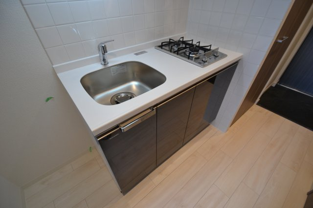 次にキッチンをご紹介いたします!キッチンは2口ガスコンロでシンクも広いです!シンクとコンロの間のスペースもあるのでお料理もしやすいです!!嬉しいですね!調理器具など食器を収納するところも、もちろんあります!キッチンの下に冷蔵庫が備え付けられている、1kなどありますがこちらはキッチン横に冷蔵庫置場あります!!