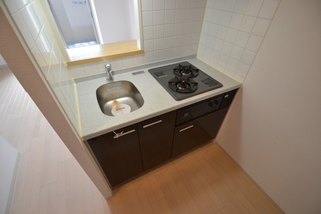 次にキッチンをご紹介いたします!カウンターキッチンになってます(^^)/2口ガスコンロ、グリルも付いております!!1Kの物件でカウンターキッチンが付いているのは珍しいですが、こちらの物件はカウンターキッチンがありオススメです!!☆