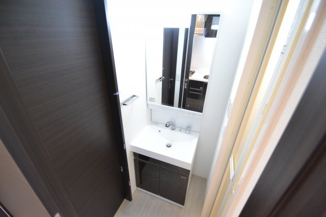 朝の身支度をスムーズにする大きな鏡を備えた独立洗面台です。鏡の横には小物を置ける棚があり、化粧品や歯ブラシなどを整理して収納できます。洗面台下部の収納には掃除用具やシャンプーのストックを収めることができ、脱衣所を常に整った状態に保てます。お風呂上がりの身だしなみチェックや、来客時にも気兼ねなく利用できるのは、独立設計ならではのメリットです。