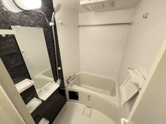 お風呂は、一日の疲れをゆったりと癒せる、清潔感と快適性を重視した空間です。浴室内はシンプルで落ち着いたデザインとなっており、圧迫感を感じにくい設計。浴槽は足を伸ばしてくつろげるサイズ感で、リラックスタイムをしっかり確保できます。