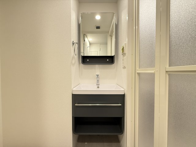 鏡は身だしなみを整えやすいサイズで、照明も明るく、細かな部分まで確認しやすくなっています。洗面台下には収納スペースが設けられており、タオルや洗剤、日用品などをまとめて収納可能。生活感を抑え、すっきりとした空間を保てます。