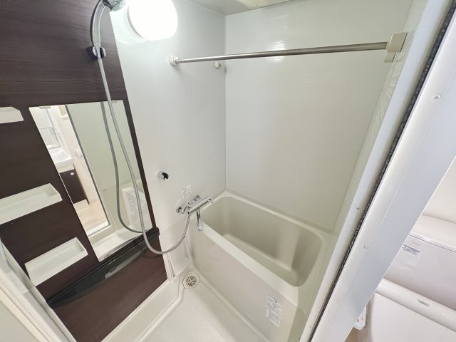 バスルームは、一日の疲れをゆったりと癒せる落ち着いた空間に仕上がっています。清潔感のある内装で、入室した瞬間から心地よさを感じられるのが特徴です。浴槽はしっかりとしたサイズ感があり、足を伸ばしてリラックスしたバスタイムを楽しめます。シャワー操作もしやすく、水温調整がスムーズなため快適な入浴が可能。壁面や床はお手入れのしやすい素材が採用されており、日々の掃除の負担を軽減します。換気設備も整っているため湿気がこもりにくく、カビ対策にも配慮。忙しい日常の中でも、オンとオフを切り替えられる上質なバスルームで、心身ともにリフレッシュできる住空間です。