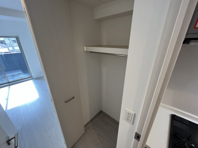 収納は、単身者の暮らしに合わせて実用性を重視した設計になっています。居室である洋室にはクローゼットが1か所設けられており、衣類や季節用品を整理して収納するのに十分なスペースが確保されています。クローゼット内部はバーと棚があり、ハンガーで洋服を掛けたり、収納ボックスを使って小物を整頓することができます。単身用のワンルームとしては使い勝手の良いサイズで、日常的な衣類やバッグ、雑貨類の整理に適しています。