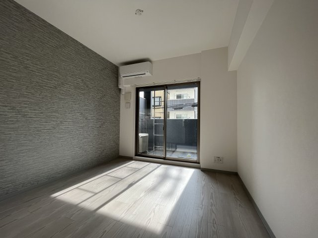 洋室は、7.2帖の広さがある単身向けの居室です。間取りは1Kとなっており、7.2帖の洋室はフローリング仕様で、家具の配置がしやすく使い勝手の良い空間です。室内は落ち着いた木目調のフローリングに加えて、アクセントクロスをアクセントにしたデザインがある場合もあり、クールでシンプルな雰囲気に仕上がっています。 また、洋室には十分な収納スペースとしてクローゼットが設置されており、衣類や日用品の整理にも対応できます。7.2帖の広さは一人暮らしの居室としては余裕があり、ベッド、ソファ、テーブルなどを配置しても圧迫感が出にくい点が魅力です。レイアウト次第では生活スペースと作業・寝室を明確に分けて使うこともできます。